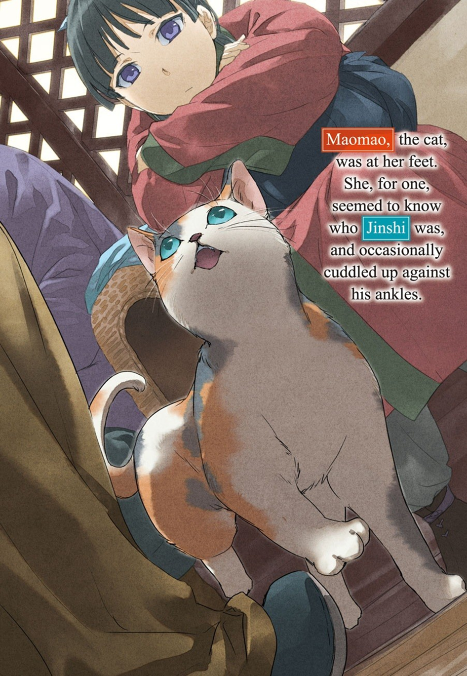 Шарлатан передал кошку женщине, та улыбнулась и погладила её по шерсти. Должно быть, он заранее предупредил её, что принесёт животное. Однако он, очевидно, не сообщил ей, что будет путешествовать с целой свитой, потому что она с удивлением посмотрела на Маомао и остальных.
